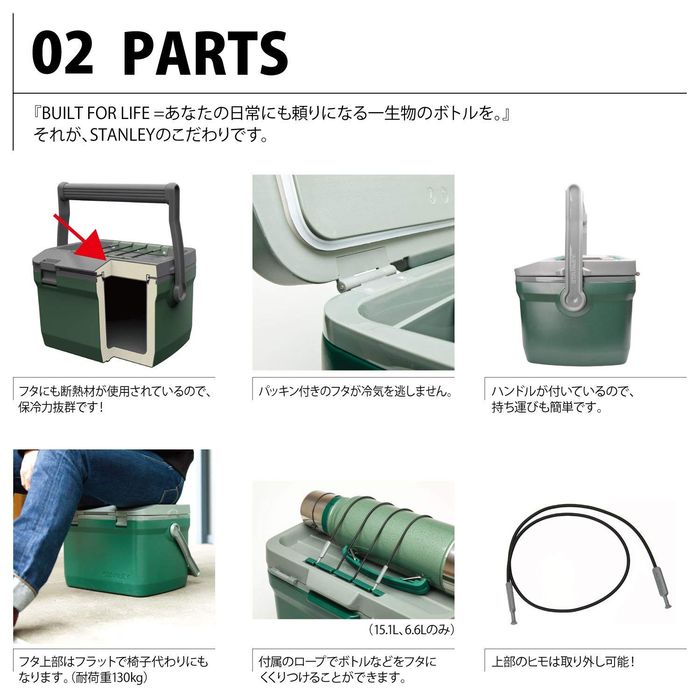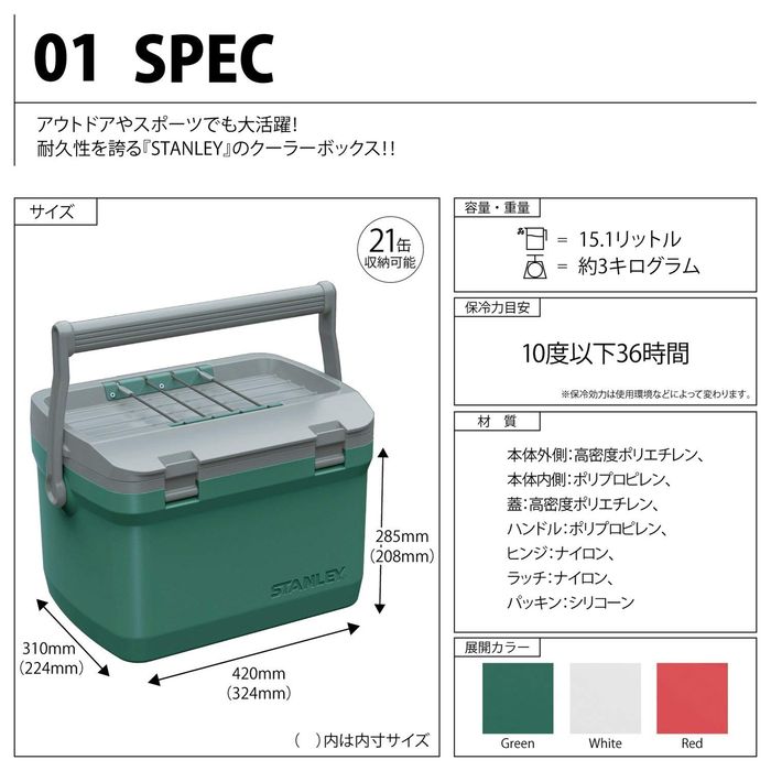 商品名 クーラーボックス 15.1L ブランド スタンレー STANLEY カラー グリーン サイズ 外寸:幅42×高さ28.5×奥行き31cm 内寸:幅32.4×高さ20.8×奥行き22.4cm 重量 約3kg 容量 15.1L 材質 本体外部:高密度ポリエチレン フタ:高密度ポリエチレン 本体内部:ポリプロピレン ハンドル:ポリプロピレン 蝶番:ポリアミド パッキン:シリコン 仕様 保冷力目安:6時間-2度以下、24時間-2度以下、36時間-10度以下フタのロープ部分には真空ボトル1Lがちょうど挟むことができます。